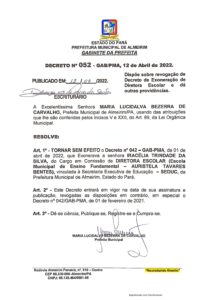 Decreto nº 052-2022 – Dispõe sobre Revogação de Exoneração de Diretora Escolar Senhora Iracélia Trindade da Silva.