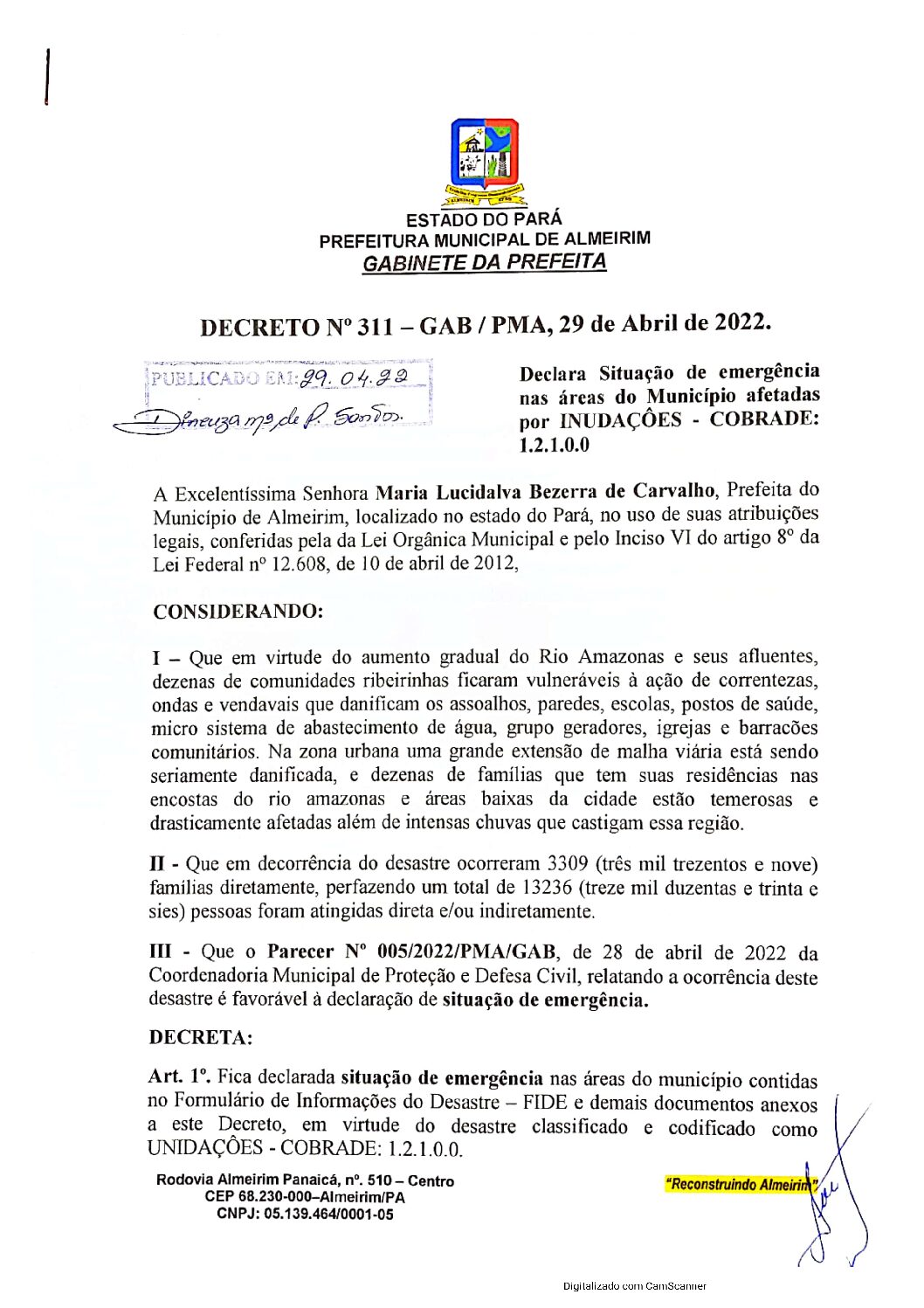 Decreto nº 311-2022 – Declara Situação de Emergência nas Áreas do Municipio afetadas por Inundações.
