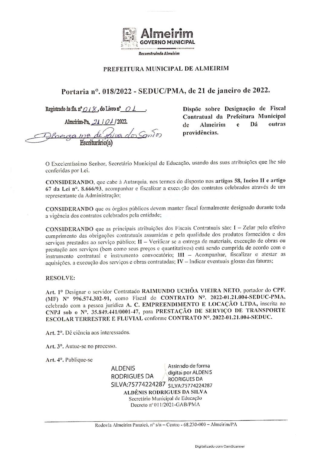 Portaria nº 018-2022 SEDUC – Dispõe sobre Designação de Fiscal Contratual da PMA-PA Senhor Raimundo Uchôa Vieira Neto.
