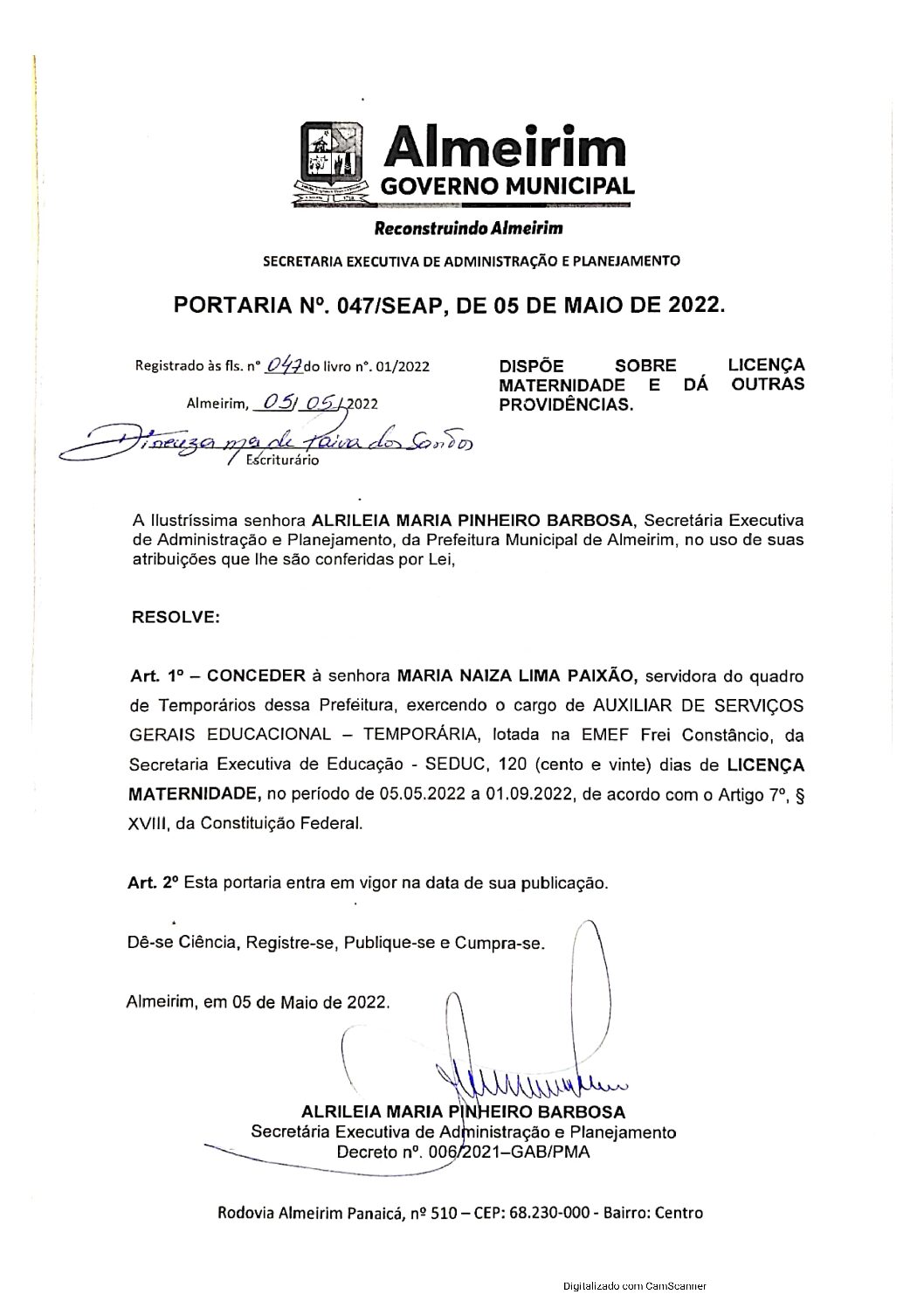 Portaria nº 047-2022 SEAP – Dispõe sobre Licença Maternidade a Servidora Maria Naiza Lima Paixão.